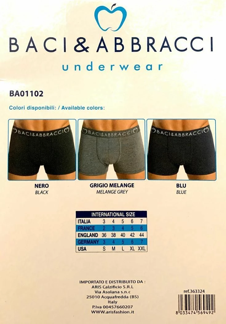 Boxer Uomo cotone elasticizzato Baci & Abbracci 1102 Boxer Uomo tinta unita con elastico esterno con scritta in cotone elasticizzato attillato aderisce e si modella perfettamente per un massimo confort in confezione offerta e 3 pezzi